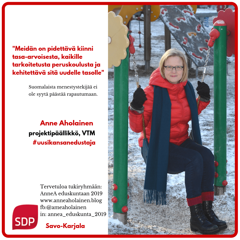 Meidän on pidettävä kiinni tasa-arvoisesta, kaikille tarkoitetusta, peruskoulusta, ja kehittävä sitä uudelle tasolle. Suomalaista menestystekijää ei ole syytä päästää rapautumaan.