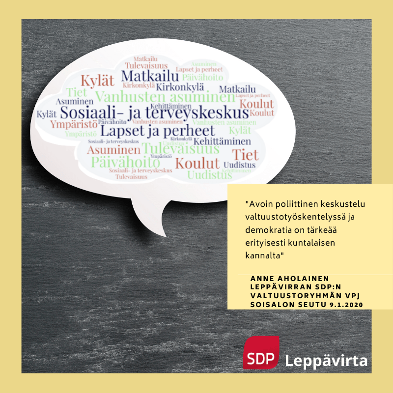 Luimme mielenkiinnolla kunnanhallituksen puheenjohtajan Aino Kanniaisen haastattelun Soisalon Seudusta 31.12.2019. Leppävirran sosialidemokraattinen valtuustoryhmä on mielellään tekemässä pohjaa huomisen hyvinvoinnille. Näemme tärkeänä, että tätä pohjaa luodaan kuntalaisten tarpeiden mukaisesti.