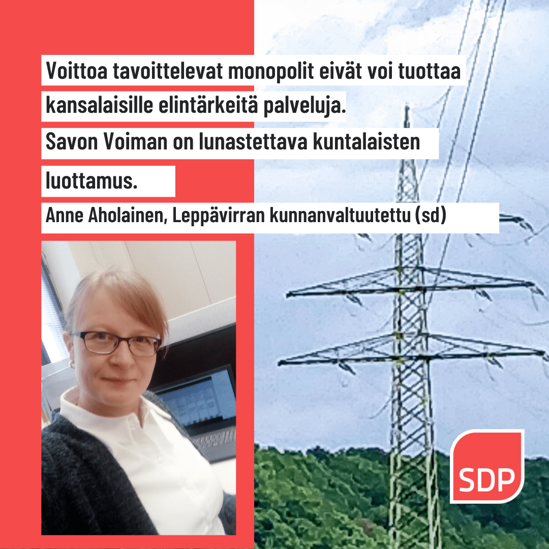 Sähkö on nyky-yhteiskunnassa tarve, jota ilman on vaikea arkea pyörittää. Kuluttajina olemme täysin jakeluyhtiön armoilla, sillä sillä on monipoliasema sähköverkon suhteen. Kuntien omistamana yhtiönä Savon Voima Oy voisi perustaa hintapolitiikkansa kustannustehokkaaseen sähköverkon ylläpitoon ja tarpeenmukaisten investointien tekemiseen. Kuluttajan näkökulmasta vaikuttaa kuitenkin siltä, että hinnat nostetaan tappiin mahdollisimman suuren voiton tavoittamiseksi – koska näin monopolina voi tehdä. Kunnille tuloutetut varat ovat kuntalaisten näkökulmasta piiloverotusta, johon ei pysty vaikuttamaan kunnallisen demokratian, saati sitten kuluttajan oikeuksien, myötä.