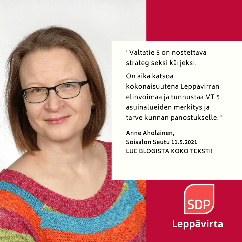 Valtatie 5 on nostettava strategiseksi kärjeksi. Tie kulkee n. 45 kilometrin pituudelta Leppävirran läpi ja yhdistää kaksi kaupunkia. Sen kylät ovat kotina n. 1700 leppävirtalaiselle. VT 5 on työssäkäynnin, opiskelun ja palvelujen saamisen väylä leppävirtalaisille.